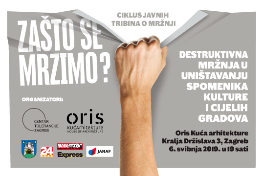 U ponedjeljak, 6. svibnja s početkom u 19 sati, u Oris Kući arhitekture (Kralja Držislava 3, Zagreb), održat će se javna tribina o mržnji naziva Destruktivna mržnja u uništavanju spomenika kulture, spomeničke baštine, sakralne baštine i cijelih gradova koju organizira Centar za promicanje tolerancije i očuvanje sjećanja na holokaust.